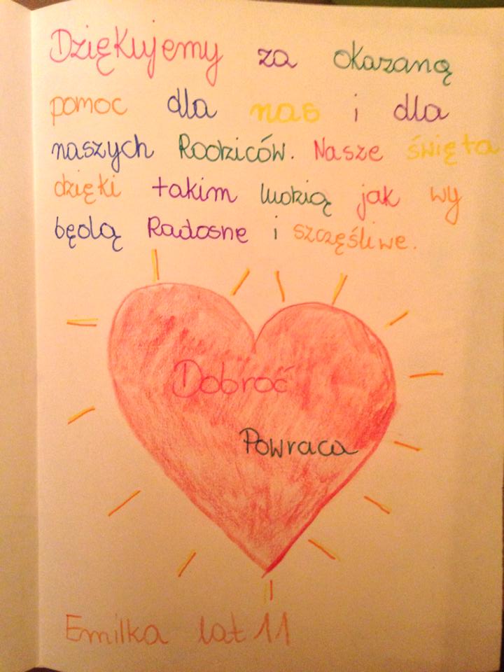 Paczki zostały dostarczone rodzinie przez p. D. Kopińską z pomocą wolontariuszy 13.XII.2014r. (sobota). Cała rodzina była pod wielkim wrażeniem oraz zaskoczeniem kiedy zobaczyła ile otrzymała darów. Rodzice nie kryli łez wzruszenia na widok podarowanej żywności, której ciągle brakowało. Natomiast dzieci bardzo cieszyły się