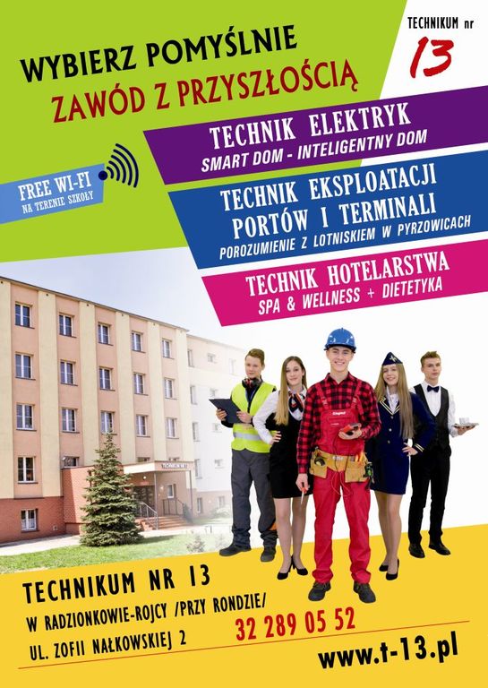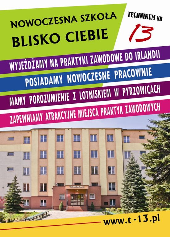 Przedstawiamy ofertę edukacyjną Technikum nr 13 w Radzionkowie. Zapraszamy ósmoklasistów do zapoznania się z informacjami na załączonych plakatach i stronie internetowej szkoły http://t-13.pl/