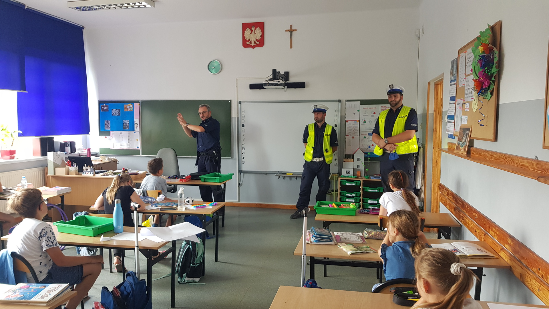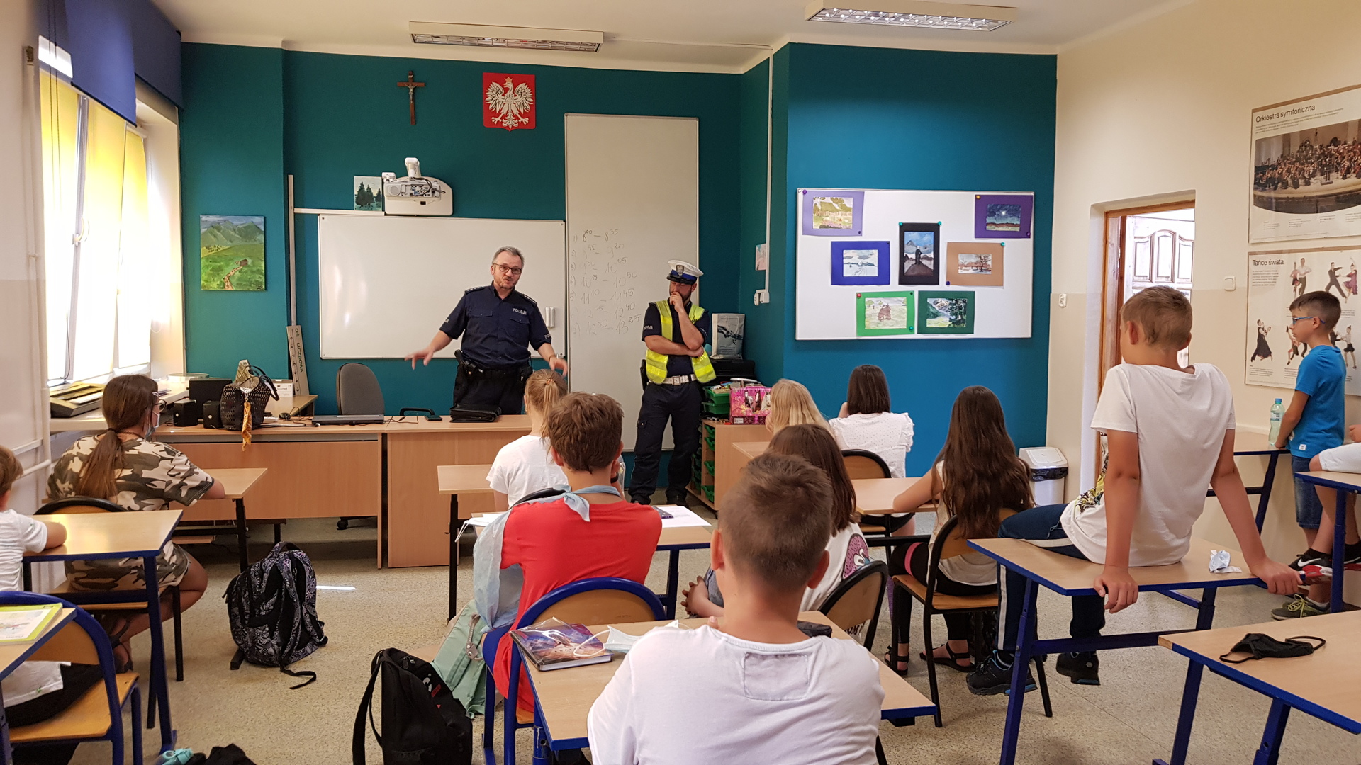 Policjanci przypomnieli uczniom zasady bezpieczeństwa na drodze, nad wodą i w górach oraz w czasie burzy. Zwrócili również uwagę na zagrożenia ze strony osób nieznajomych proponujących poczęstunek, wspólną zabawę lub spotkanie, a w szczególnosci w wirtualnej rzeczywistości.