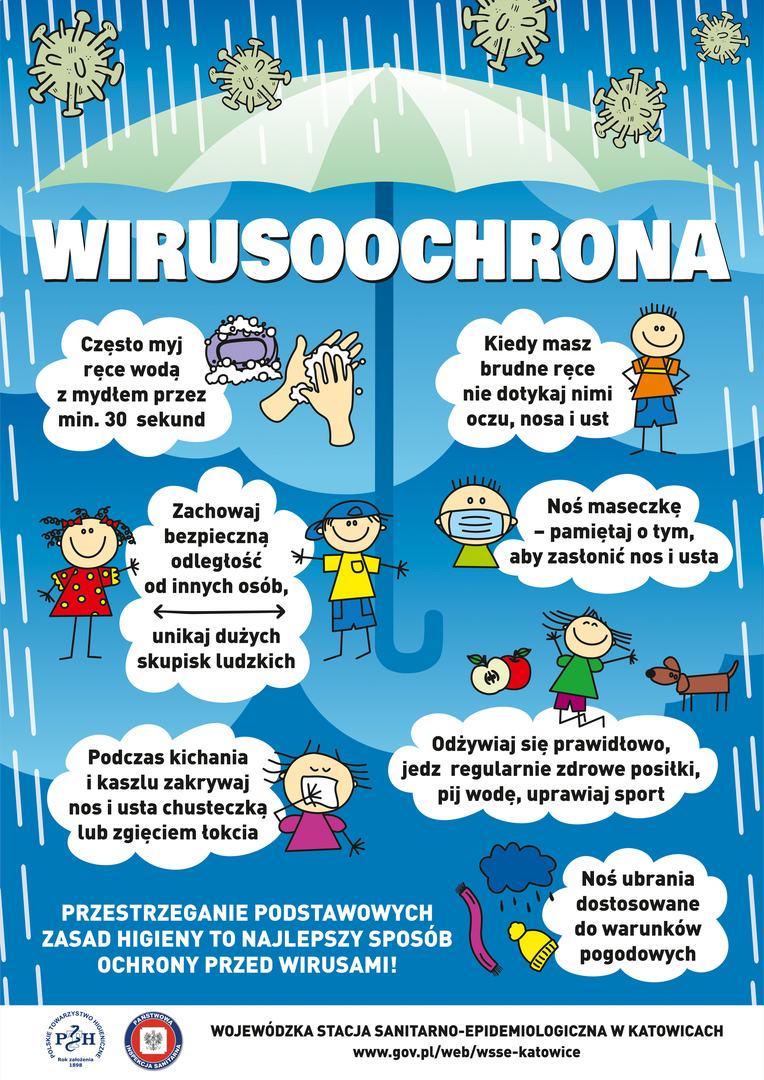 W naszej szkole odbyła się akcja informacyjno-edukacyjna pt. „Wirusoochrona” organizowana przez Wojewódzką Stację Sanitarno-Epidemiologiczną w Katowicach. W związku z tym, przeprowadzono w klasach 1-3 i świetlicy szkolnej liczne pogadanki i zajęcia w trakcie których dzieci mogły pogłębiać wiedzę z zakresu zapobiegania chorobom zakaźnym przenoszonym drogą kropelkową ze szczególnym uwzględnieniem profilaktyki koronawirusa i grypy. Zajęciom towarzyszyły liczne zabawy. Dzieci były na bieżąco informowane o skutkach braku higieny oraz zasadach mycia i dezynfekcji rąk, zakrywania nosa. Uczniowie tworzyli prace plastyczne na temat higieny i bezpieczeństwa, rozwiązywali quizy i krzyżówki, uczyli się piosenki „Mydło - woda - tak się zaczyna wirusoochrona”. W ramach akcji powstał plakat „Grypo nie chcemy Cię w naszym domu”.