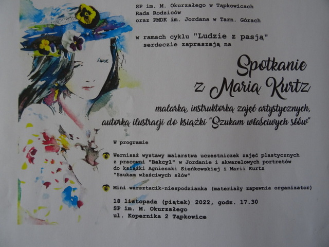 Rada Rodziców Szkoły Podstawowej w Tąpkowicach zaprasza na spotkanie z panią Marią Kurtz - malarką, instruktorką zajęć artystycznych, autorką ilustracji do książki "Szukam właściwych słów".
