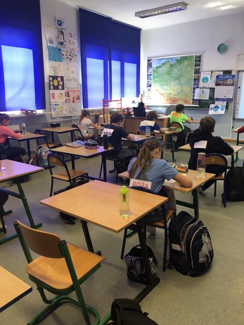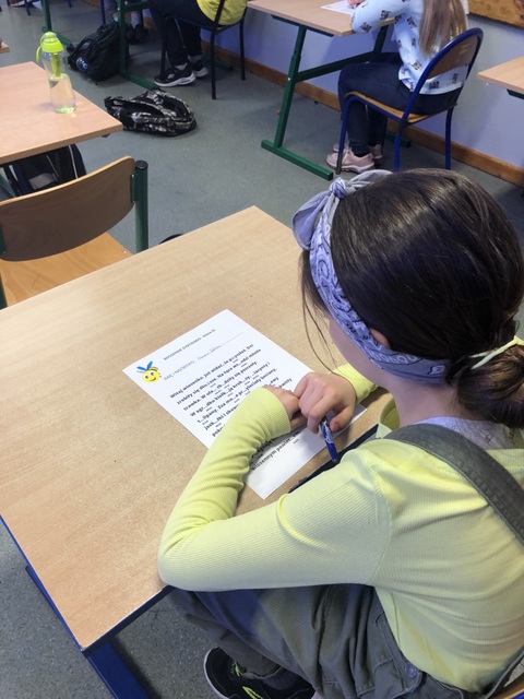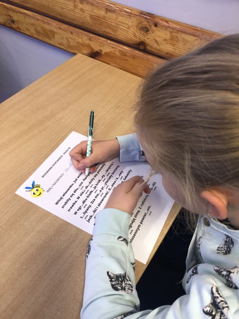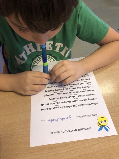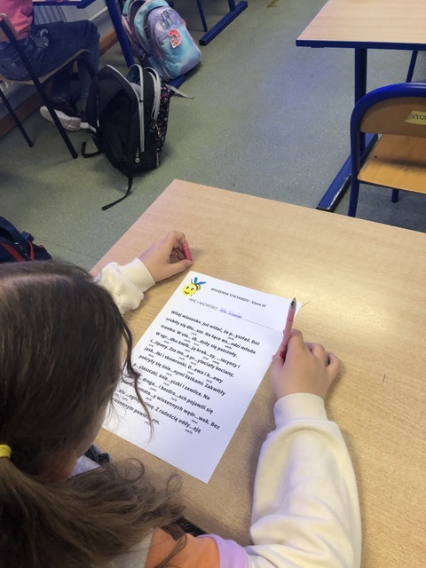 Uczniowie musieli wpisać właściwe litery, wpisując musieli wykazać się znajomością reguł ortograficznych.
