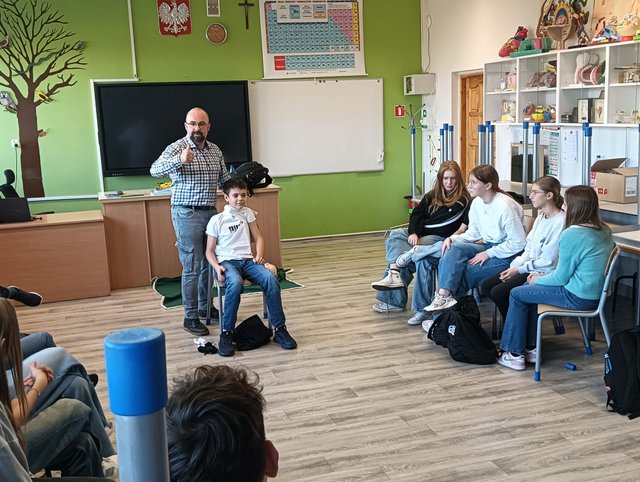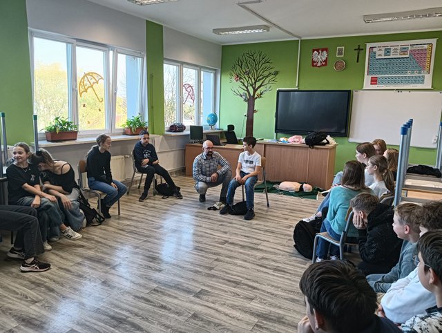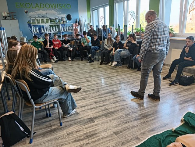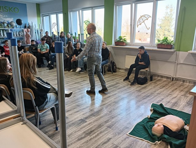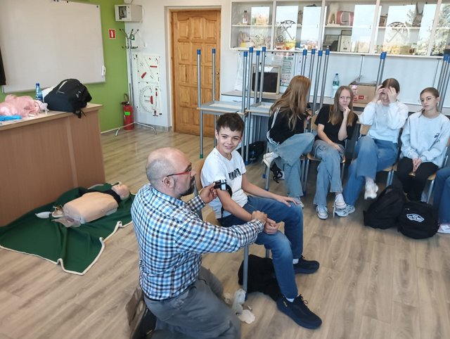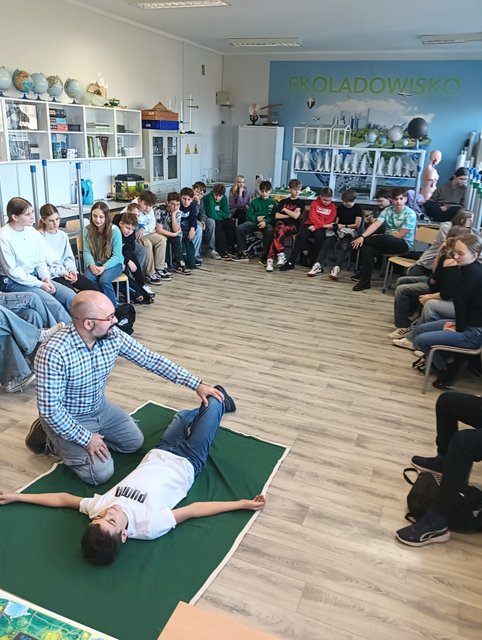 Tym razem "wziął na warsztat" siódmoklasistów i w ciągu dwóch godzin lekcyjnych w bardzo praktyczny i obrazowy sposób przekazał wiedzę nt. pierwszej pomocy .